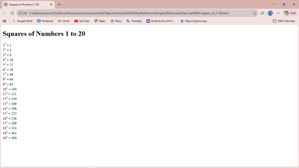 Exercise 1: Print the squares of the numbers 1 – 20. Each number should be on a separate line ,next to it the number 2 superscripted, an equal sign and the result. (Example: 102 =100)