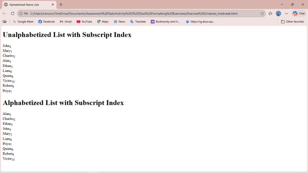 Exercise 2: Prints 10 names with a line break between each name. The list should be alphabetized, and to do this place a subscripted number next to each name base on where it will go in the alphabetized list. (Example: Alan1). Print first, the
