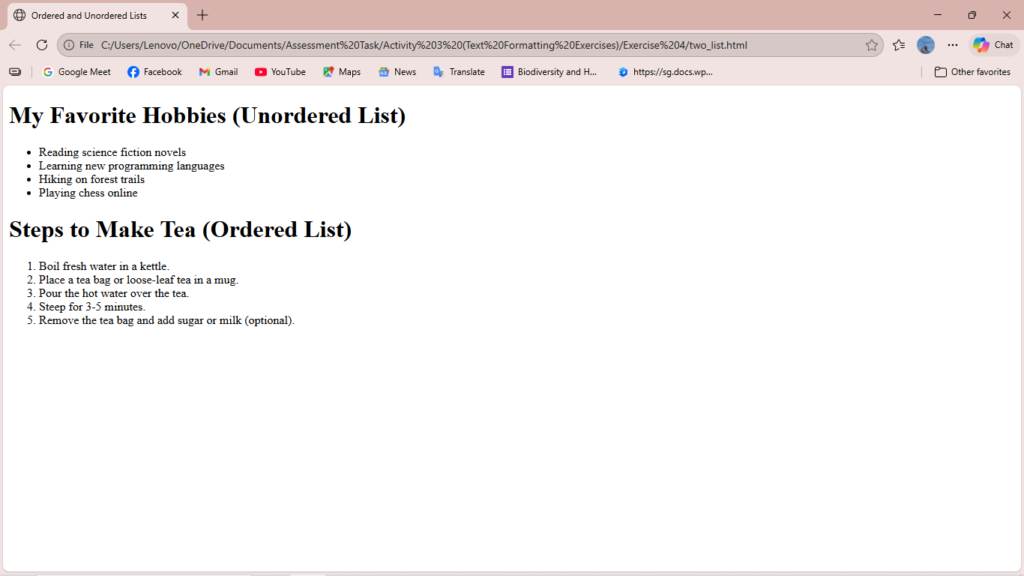 Exercise 4: Print two lists with any information you want. One list should be an ordered list, the other list should be an unordered list.