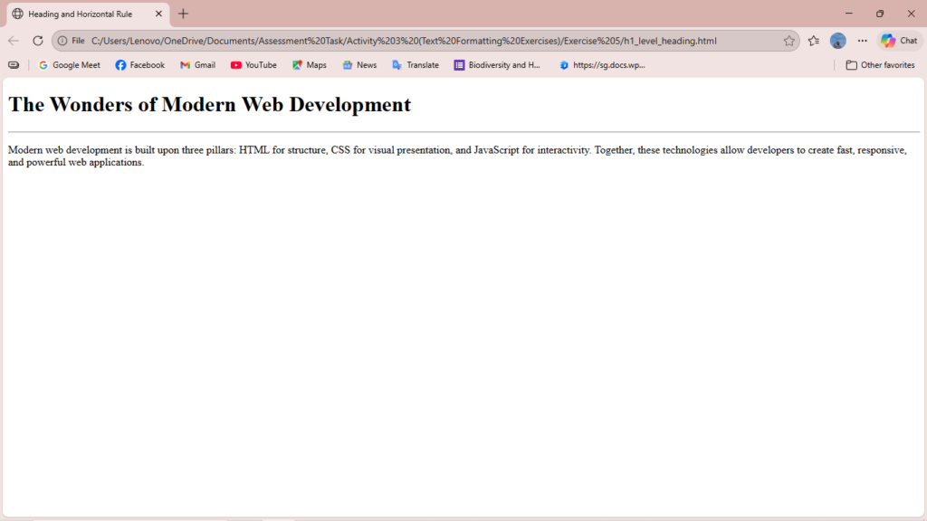 Exercise 5: Prints an h1 level heading followed by a horizontal line whose width is 100%. Below the horizontal line print a paragraph relating to the text in the heading.
