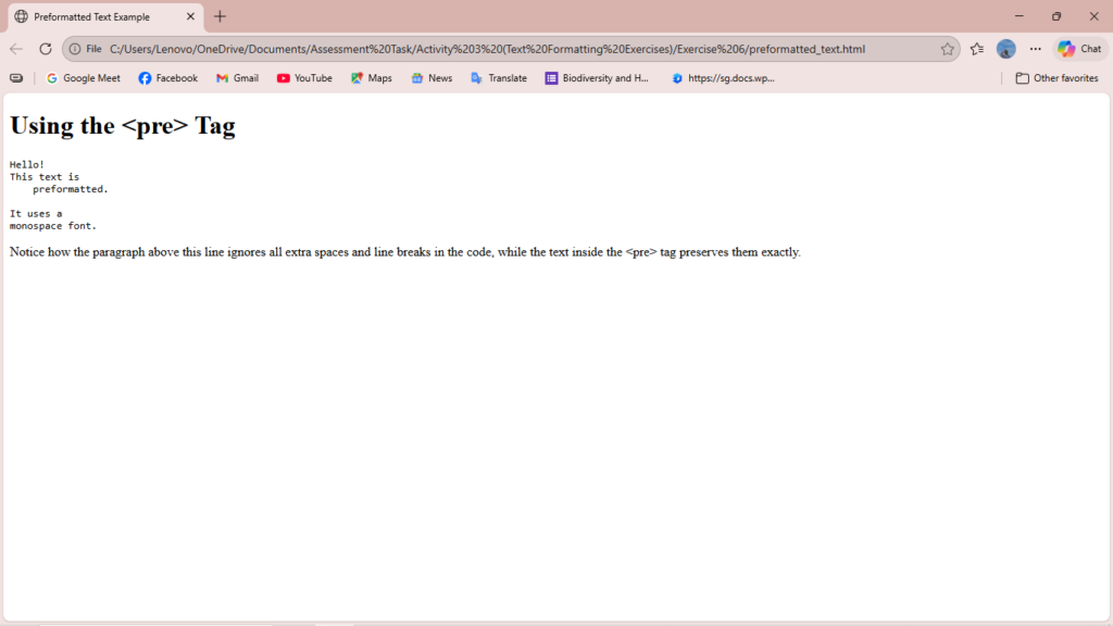 Exercise 6: Print some preformatted text of your choosing. (hint: use the tag)