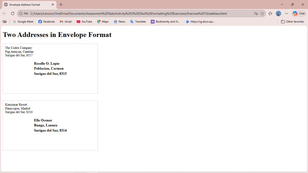 Exercise 10: Print two addresses in the same format used on the front of envelopes (senders address in top left corner, receivers address in the center).