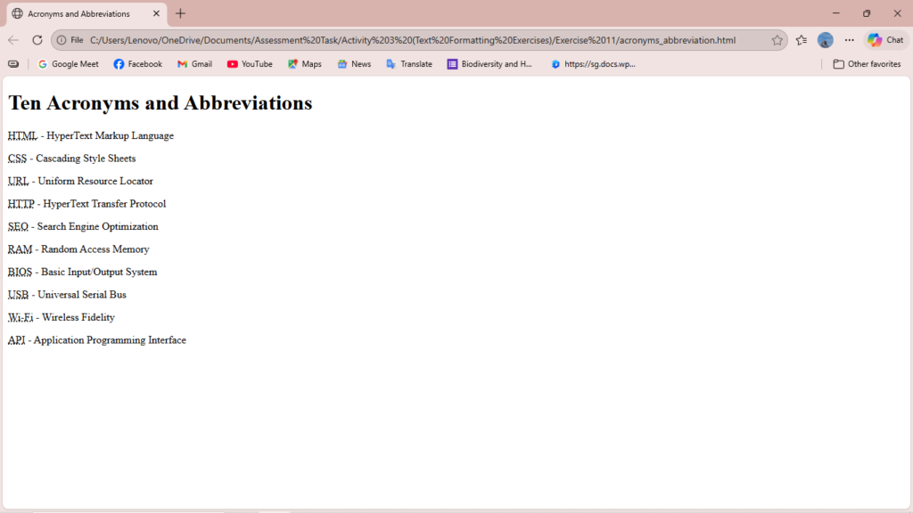Exercise 11: Print ten acronyms and abbreviations of your choosing, each separated by two lines. Specify the data that the abbreviations and acronyms represent.