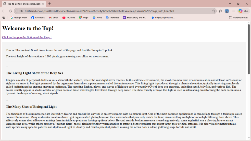 Exercise 5: Create a page with a link at the top of it that when clicked will jump all the way to the bottom of the page. At the bottom of the page there should be a link to jump back to the top of the page.