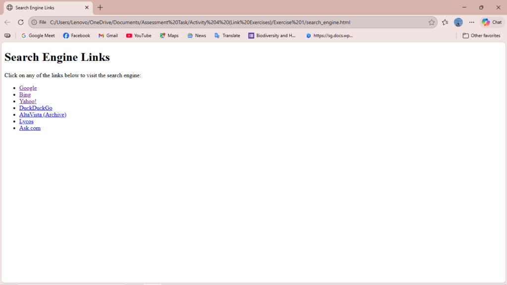 Exercise 1: Create some links to various search engines (google, yahoo, altavista, lycos, etc).