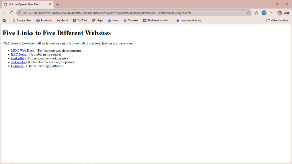 Exercise 2: Create links to five different pages on five different websites that should all open in a new window.