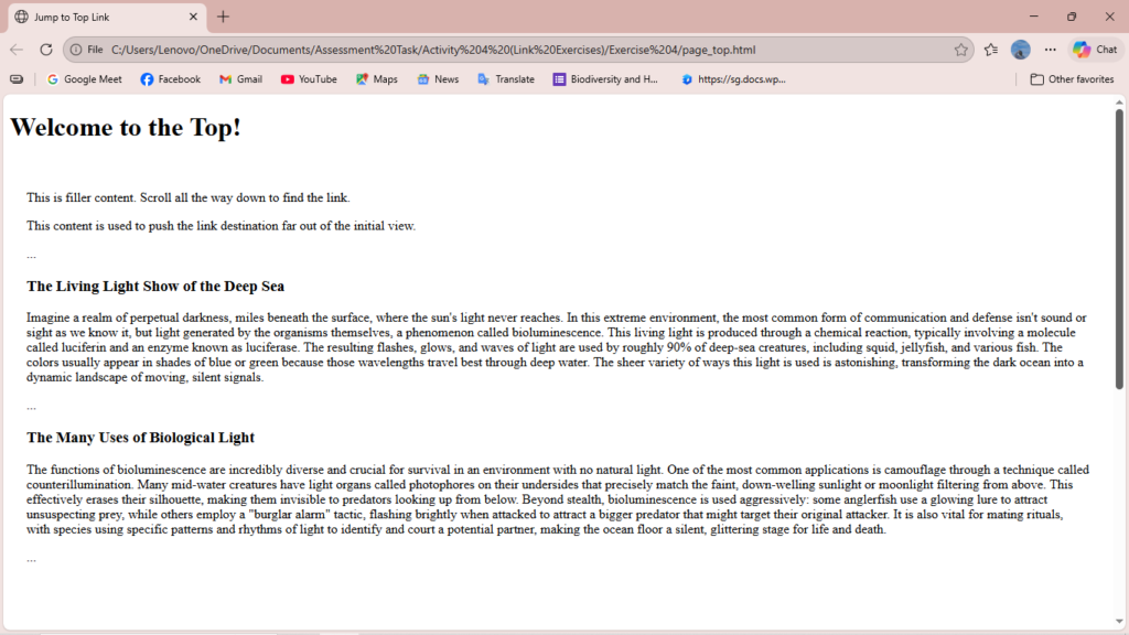Exercise 4: Create a page with a link at the bottom of it that when clicked will jump all the way to the top of the page.