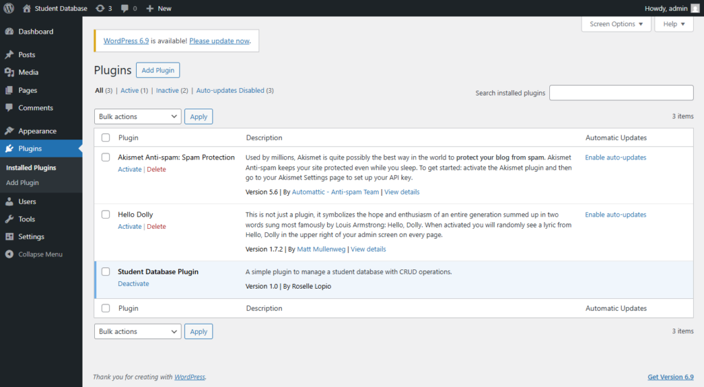 * Description: A simple plugin to manage a student database with CRUD operations.